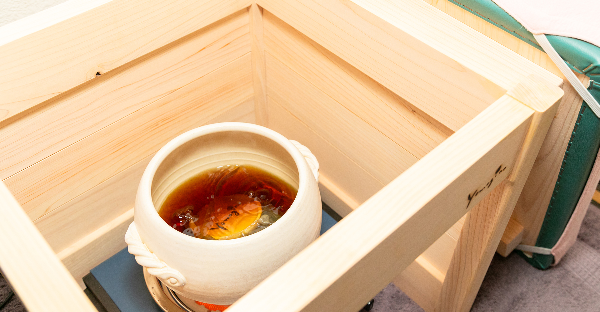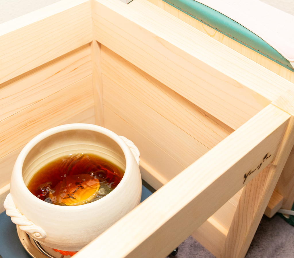 よもぎの葉を蒸した蒸気を直接、肌や粘膜から吸収させることにより、腸や子宮を含め、身体全体を内側から温めていく施術です。