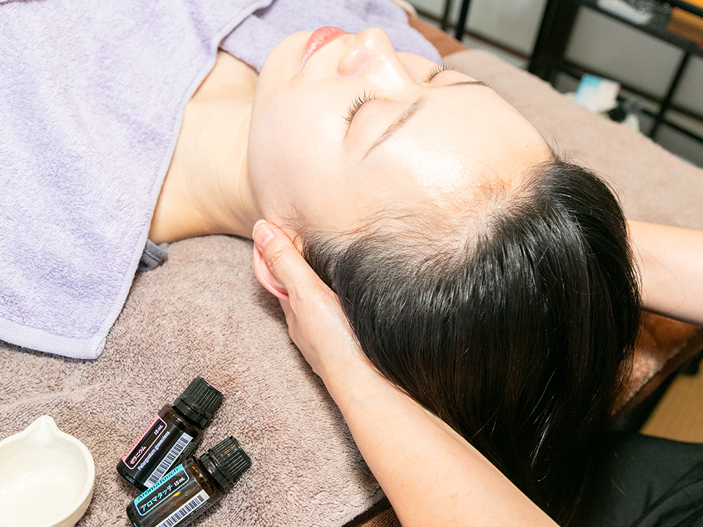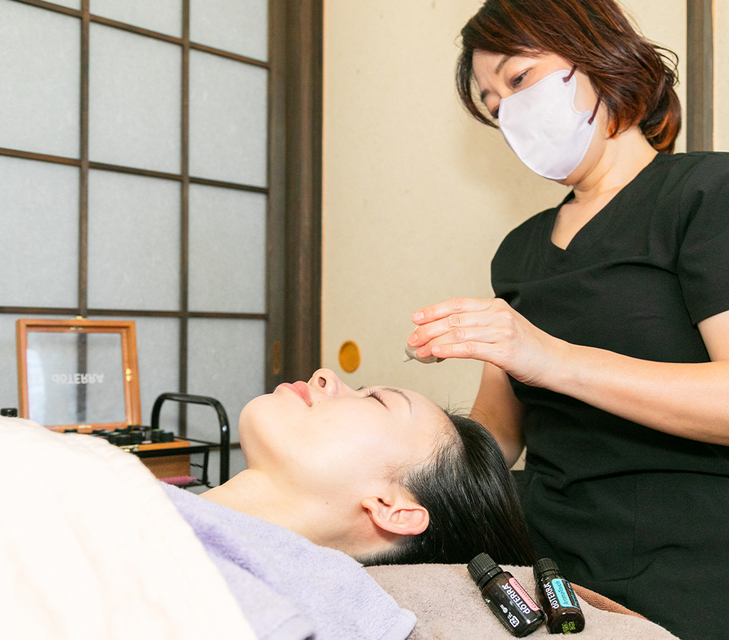 心身のバランス調整にかかわる脊椎(背骨)周辺と足裏にエッセンシャルオイルを塗布し、優しいタッチケアで精油を浸透させていく施術です。
